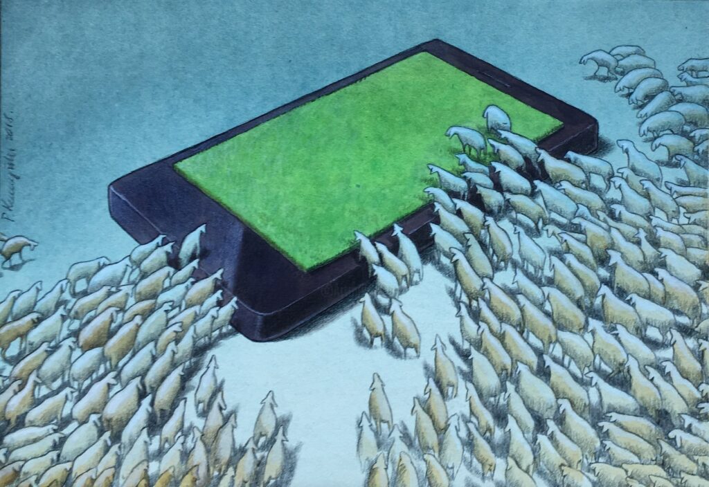 Es stimmt, dass wir den Ereignissen um uns herum nicht gleichgültig gegenüberstehen sollten, denn freiwillige Entfremdung ist nichts anderes als der Versuch, der Realität zu entfliehen. Doch wir sollten auch nicht gedankenlos und ohne jegliches Urteilsvermögen den Nachrichtenwirbel um uns herum konsumieren, denn dadurch riskieren wir, keine Zeit mehr für die notwendige Selbstreflexion und Bewertung unseres Lebensweges zu haben, wie es das dritte Gebot fordert.