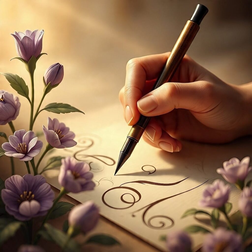 In einer technologischen Welt, in der man ständig klickt, schätze ich diejenigen, die mit der Hand schreiben. Manche Menschen tun es mit so viel Begeisterung, daß ich es Kunst nenne. Der erste Brief erinnert an eine Einladung: ein Geburtstag, eine Hochzeit, ein Abschluß, eine Buchvorstellung … Dann wird alles sorgfältig geschrieben, ähnlich einem Kalligrafie-Notizbuch. Sie verzaubern alles, was sie berühren, mit ihrer Gabe der Worte.